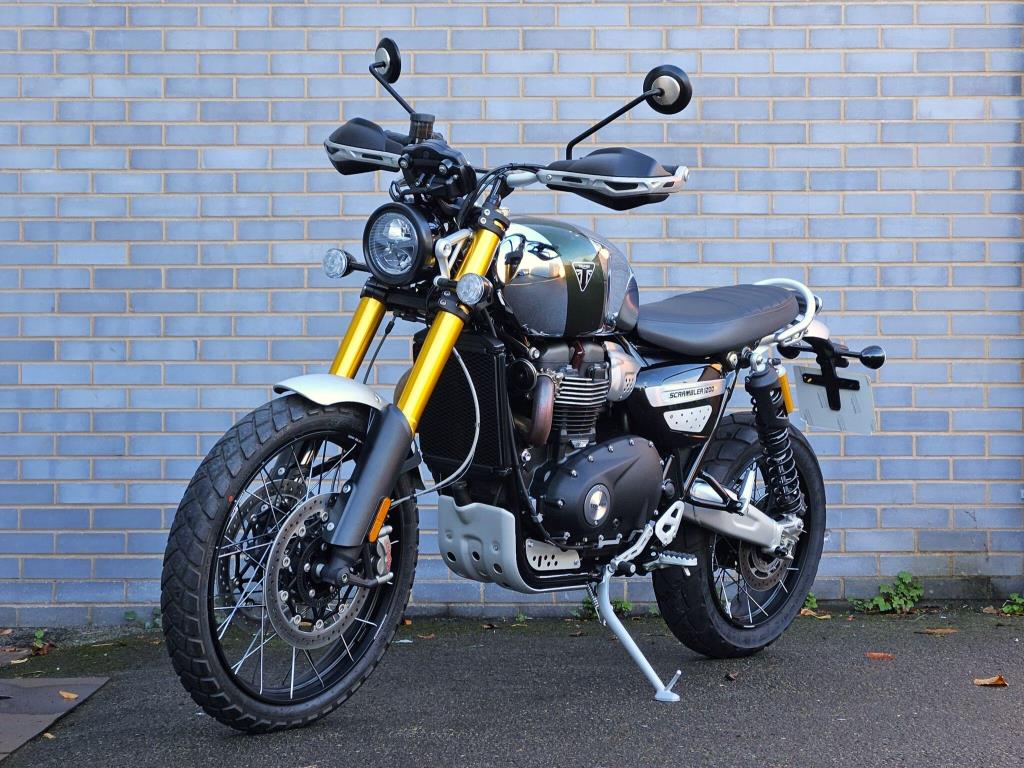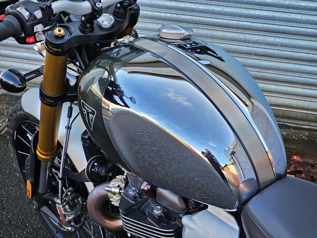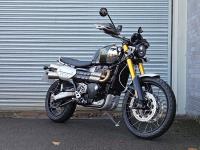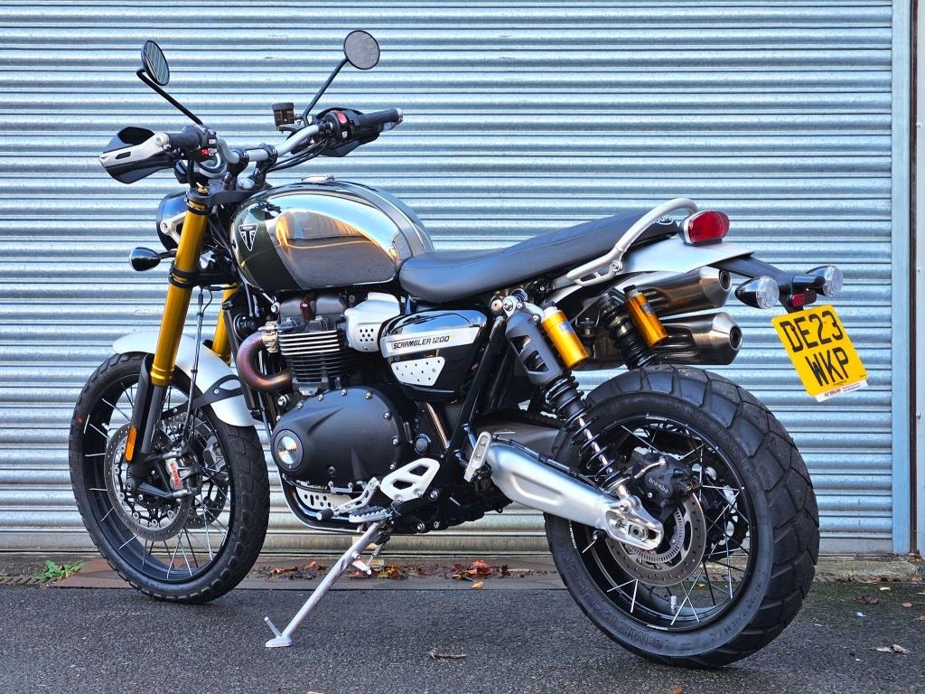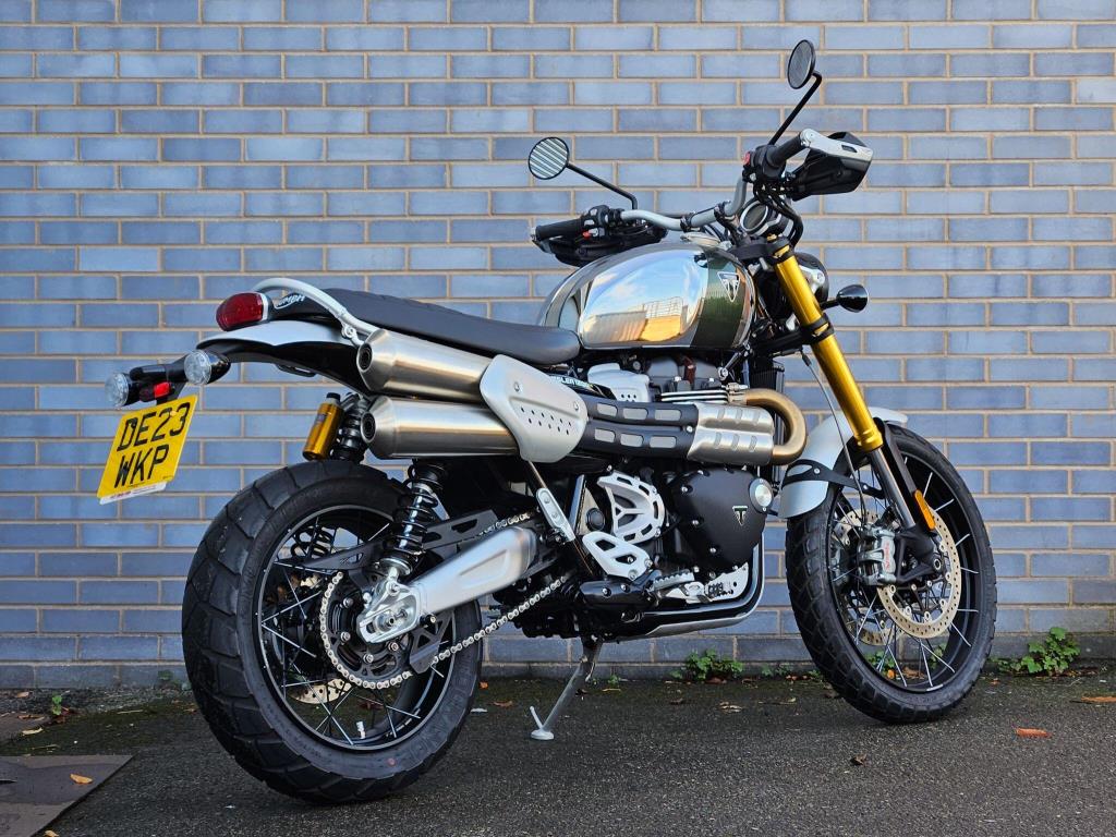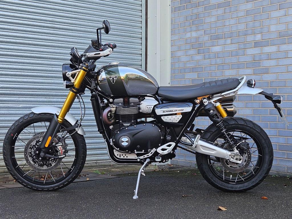 Keyless Ignition, Full Service History, Owner’s Manual & Service Records.Experience true modern classic performance with this 2023 Triumph Scrambler 1200 XE Chrome Edition, presented in outstanding condition with low mileage. This limited-run Chrome Edition stands out with its stunning mirror-finish chrome tank and premium detailing, offering exclusivity and head-turning style. Powered by Triumph’s high-power 1200 cc parallel-twin engine producing 89 bhp and 110 Nm of torque, the Scrambler 1200 XE delivers effortless performance both on and off the road. Featuring fully-adjustable Showa long-travel front forks, Öhlins twin rear shocks, Brembo M50 radial brakes, and a 21-inch front wheel, it combines class-leading capability with refined comfort. The XE specification includes multiple riding modes, switchable ABS and traction control, keyless ignition, cruise control, and My Triumph connectivity for seamless tech integration. Presented in excellent order throughout, this example has been carefully maintained and garage-kept, reflecting the pride of previous ownership. A rare opportunity to own the flagship Scrambler model in its most distinctive and collectible guise – the Chrome Edition